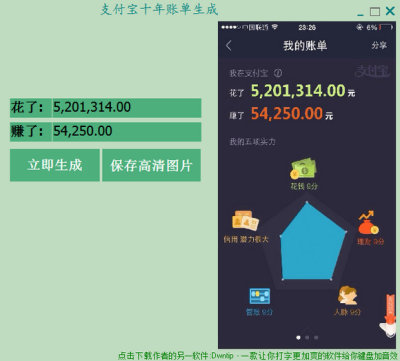 支付宝十年账单生成器是最近推出的新一代装逼神器,可以生成支付宝账单。用户有了这款支付宝十年账单生成器,就可以自己制作十年账单,生成出来图片跟真实的一模一样,需要的话可以来下载使用。
