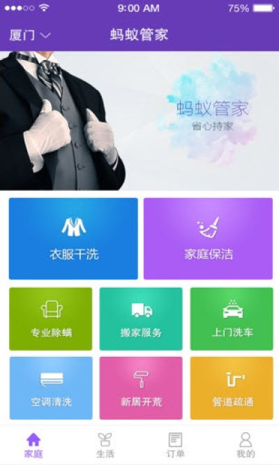 蚂蚁管家是一家致力于构造一站式家庭生活服 务,全心全力的呵护您的家庭的服务平台。承 诺让每一个用户都能免去家庭生活中的烦恼, 让每一个劳动者都能得到应有的回报。