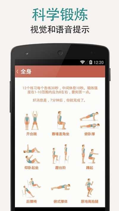 对于普通的上班一族来说每天挤出一点用于锻炼的时间是一件非常困难的事情,7分钟锻炼这款APP能够让你只花七分钟的时间就完成长时间的等量运动量。如果你还在为没有时间锻炼苦恼的话,就快来试试它吧。