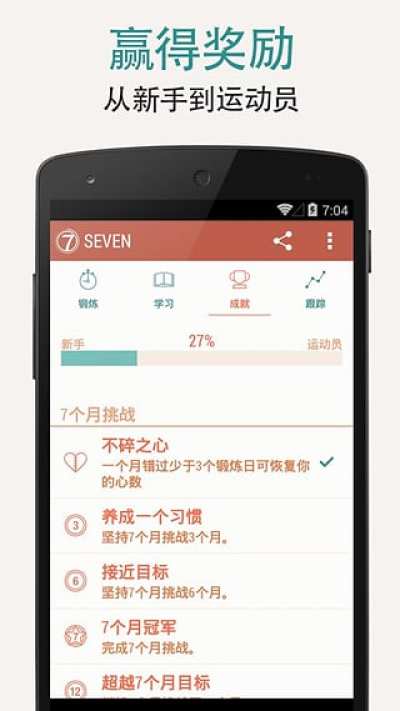 就像视频游戏一样,Seven开始有三条命。跳过一天即失去一颗心,一个月错过3次锻炼,进度将重置为零,即Game Over了!每天锻炼并坚持7个月可实现100%并成为7/7冠军。