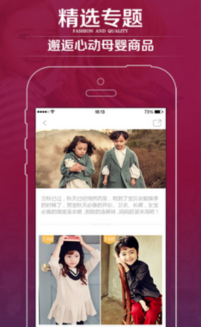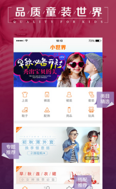 打开小世界,就走进了儿童世界,这里不仅是最新最潮流童装、童鞋及儿童用品的shopping mall,同时还有大量各种风格气质的潮宝搭配供参考学习,让你足不出户,轻松将自家宝宝装扮成明星宝宝,更有最专业的场景式导购,让妈妈更省心。