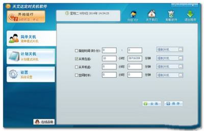 天艾达定时关机软件有两种不同的自动关机任务模式可选择,在简单模式里你可以设置"在指定时间点关机","从现在起多长时间后关机","从开机起多长时间后关机" 及 "无鼠标键盘输入多长时间后关机"。在计划关机模式里你可以对一个星期里,从星期一到星期天的每一天设置五个不同的关机时间, 该自动关机软件随开机启动后自动检测, 如果在你设置的关机时间范围内就会自动关机. 你可以同时选择多个关机条件,这时该定时关机软件就会在最先到达的条件时间点上自动关机。这是多完美的组合!