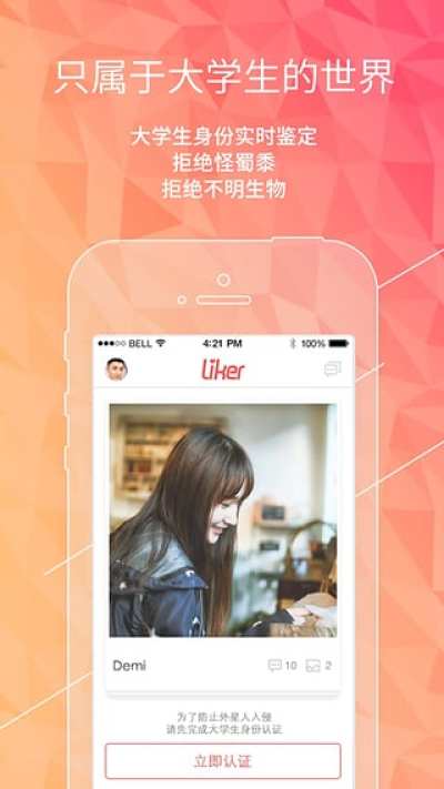 1、只有通过大学生身份鉴定的用户才能使用liker,用户信息真实可靠,杜绝怪蜀黍、告别虚假用户。一款真正意义上只有大学生可以使用的APP。