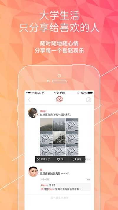 liker采用大学生身份实时鉴定的方法创造出一个只属于大学生的世界,能够极速的扩大社交圈,将大学生活分享给有共鸣的同学。