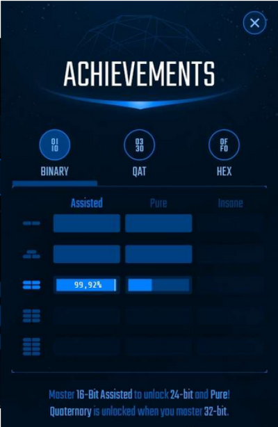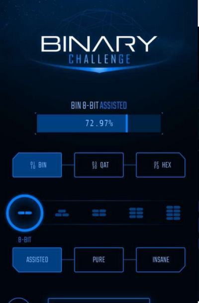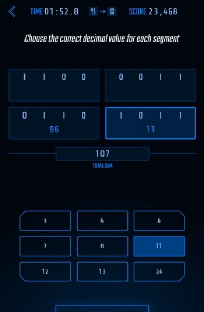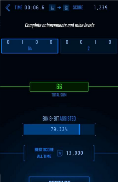 二进制大挑战是一款非常考验玩家数学能力的益智类游戏,二进制大挑战能够使你用心算将二进制(和十六进制)数转换为十进制数的速度越来越快。该款游戏中有高达 32 位二进制数,方便你学习二进制,还支持四进制和十六进制,且每种进制形式中,还拥有三种不同的推测模式——是唯一一款能够实现以上所有功能的游戏!