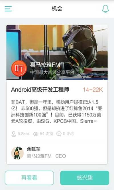 【职位更真实】只用5秒就能看明白一个职位,前所未有的大图展示、地理位置、融资、产品、福利等,让你能真实地了解招聘最重要信息;