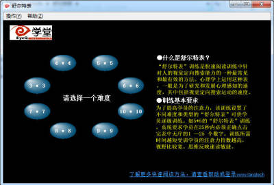 易学堂舒尔特表练习软件是一款由易学堂软件推出的操作简单,功能界面设置合理的免费注意力训练软件。通过舒尔特表可以训练视觉广度,增强视感知能力。同时还可以发展心里感知的速度,包括视觉定向搜索运动的速度,达到加快阅读速度的效果,从而提高阅读效率。