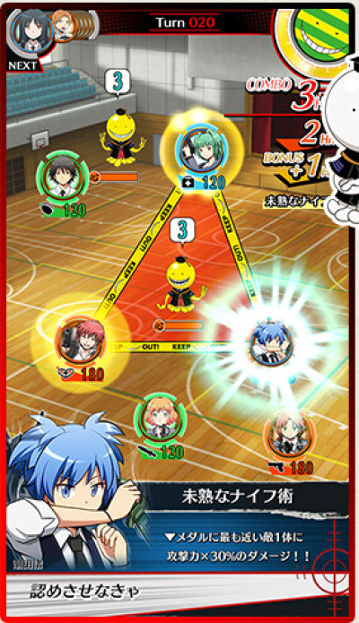 在游戏中,玩家需要以潮田渚、赤羽业、茅野枫这三名3年E班的学生包围目标,然后发动暗杀技能把目标杀掉。当然,除了“杀老师”之外,目标还会是其他人!