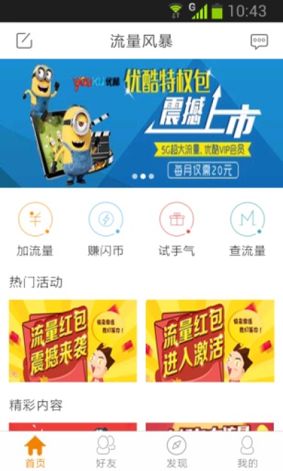 1.免费流量:注册使用流量风暴,参与活动,获取免费手机流量;2.流量加油:多种流量选择,订购还有额外奖励;3.免费礼品:登陆流量风暴,赚闪币,试手气,所有礼品只需闪币不花钱; 4.流量查询:实时掌握流量使用情况,流量不够及时预知;