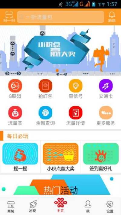 5、调整首页UI设计,增加流量荟、我的奖品等一级入口,取消归宿地查询功能,常规活动归类为每日必玩模块