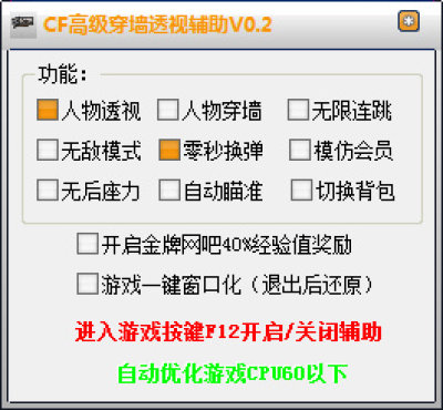 CF高级穿墙透视辅助是是一款功能强大齐全的CF游戏辅助,而且还能自动优化游戏CPU,最大化增强游戏运行速率,增加玩家游戏体验感。玩家通过该辅助能够轻松获得游戏胜利,喜欢的话可以来下载使用。