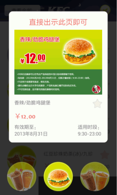 这是最实用的肯德基优惠券软件,不论你在全国哪一家肯德基门店(部分机场、火车站店除外),都可使用手机上的优惠券直接打折,与传统纸质券同享折扣。