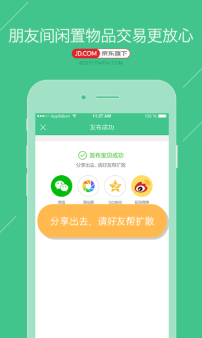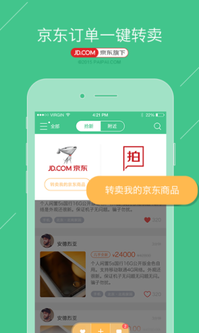 拍拍二手,拯救闲置物品的必备神器。平台免费提供交易支付托管,京东订单一键转卖、定位,语音描述宝贝详情、内置聊天等贴心功能。通过基于LBS的线上展示,和线下京东强大的物流及站点物理资源,为广大用户提供前所未有的闲置物品一站式解决方案及全新的购物社交新体验。