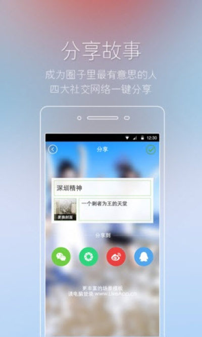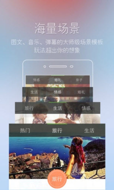 【海量场景】图文、音乐、弹幕的大师级专题场景,功能超出你想象。 【分享故事】 成为圈子里最有意思的人,微信、朋友圈、微博、QQ一键分享。