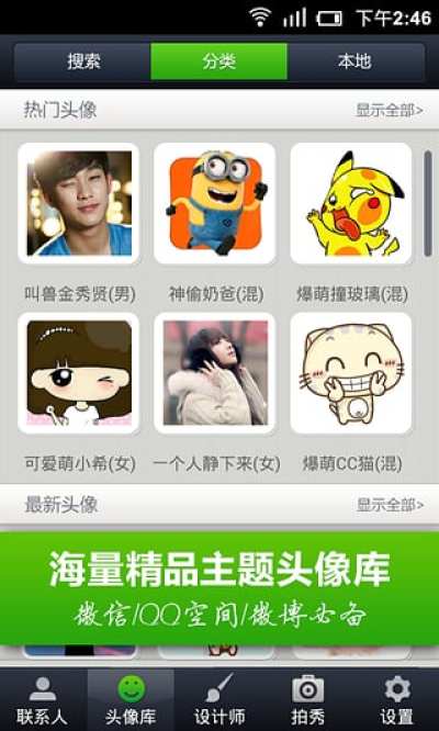 头像淘淘APP是一款能够提供种类繁多的头像造型,并能将 QQ、微博、人人的好友头像导入到联系人的免费应用。里面提供的头像非常容易识别而且有个性。