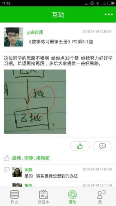 互动:你想知道这次作业谁做的最好吗,你想看看优秀作业吗?互动让你可以和同学们聊一聊优秀作业。