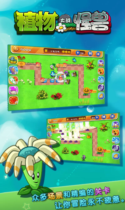 史上最火爆的塔防游戏力作《植物大战怪兽》强势来袭!植物军团再次发力,超强精英植物卫士,配备最新植物科技,陆空全方位战略性封锁战线,将所有小怪兽阻挡在入侵的道路上!3大主题场景,多个可选关卡,张牙舞爪的小萌怪兽,超强力英雄伙伴随时支援,更有陨石雨、雷暴、万里冰封等酷炫助力,带你超神带你飞!快和向日葵大大并肩作战,抵御怪兽军团的入侵吧!