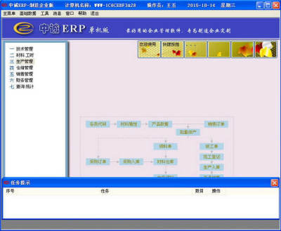 中诚ERP软件制造企业版是一款适用于轻、化工等制造行业企业生产管理软件;软件能够帮助用户管理生产物流、产品成本、生产资金等;适合化工、食品、医药、线缆、烟花、建筑材料等多种行业的生产管理。系统由技术管理、材料与工时管理、生产管理、仓储管理、供应与销售管理、财务成本核算、综合统计查询等功能模块构成。