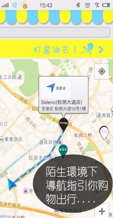 您可以看周边店家的信息并做路线导航,让您在一个陌生或附近地方可找到您所需要的商店及商品,解决您的临时购物需求。