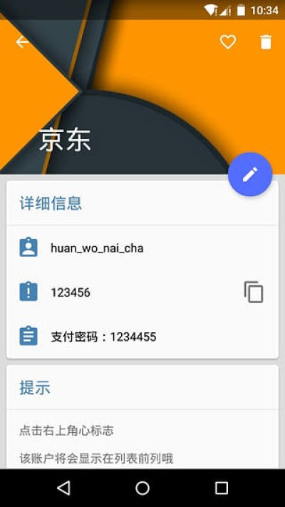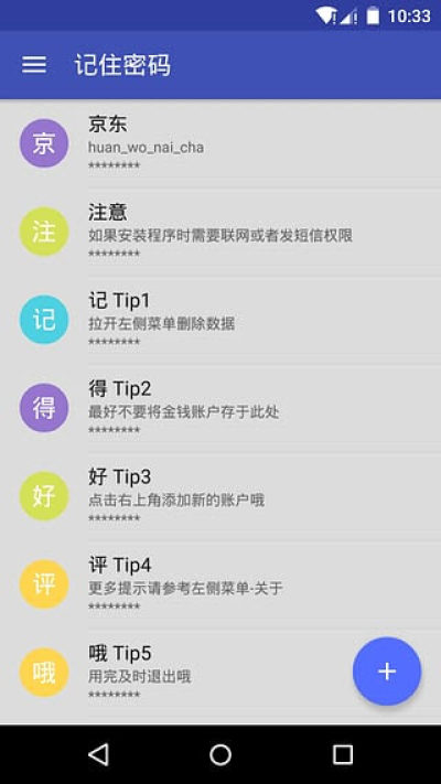 现在各种论坛、游戏、聊天软件和各种卡都需要账号和密码,不少人都必须记住大量的密码,只要忘记一种都会有很多麻烦,为了方便大家不忘记,小编特别给大家推荐这款记住密码手机应用,它是一个非常安全的密码记录工具,其使用起来十分简单,且安全稳定,绝对不会将用户的密码泄露出去,大家可以放心使用!