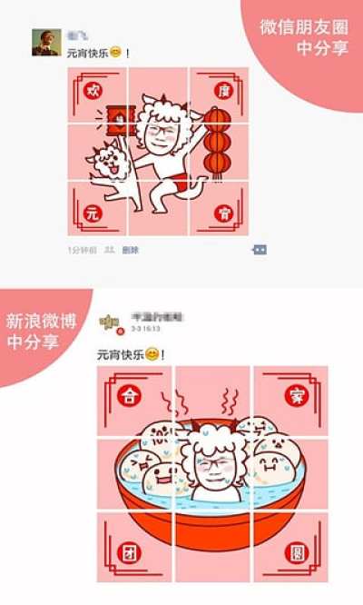 该应用可以识别一张照片中你的头像,合成一张祝福照片并切割成9张,分享到微信朋友圈、新浪微博、易信等地方。告别小小的1张缩略图,通过9张图拼接成1张大图,引爆你的社交圈吧,实乃居家旅行,夺人眼球的新年利器!