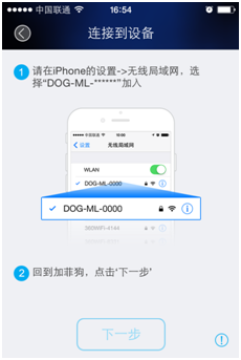 l iPhone:打开系统的“设置”—>“无线局域网”界面,选择“DOG-******”连接,再回到客户端,点击“下一步”