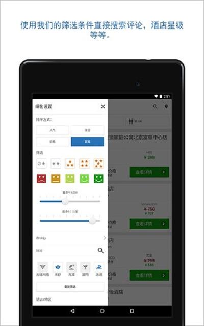 -高级筛选 设置价格,星级, 距离,设施等条件筛选更符合需求的酒店