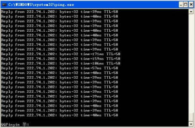 按照缺省设置,Windows上运行的Ping命令发送4个ICMP(网间控制报文协议)回送请求,每个32字节数据,如果一切正常,我们应能得到4个回送应答。 Ping能够以毫秒为单位显示发送回送请求到返回回送应答之间的时间量。如果应答时间短,表示数据包不必通过太多的路由器或网络连接速度比较快。Ping还能显示TTL(Time To Live存在时间)值,我们可以通过TTL值推算一下数据包已经通过了多少个路由器:源地点TTL起始值(就是比返回TTL略大的一个2的乘方数)-返回时TTL值。例如,返回TTL值为119,那么可以推算数据包离开源地址的TTL起始值为128,而源地点到目标地点要通过9个路由器网段(128-119);如果返回TTL值为246,TTL起始值就是256,源地点到目标地点要通过9个路由器网段。