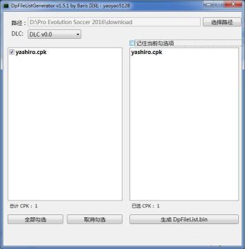 实况足球2016的各种MOD和补丁基本上都是以CPK文件的形式出现,所以大家必须要使用实况足球2016CPK文件加载工具才能正常使用这些补丁。本工具的作用就是可以快速的选择要加载的cpk补丁文件,并生成新的DpFileList.bin文件,而无需手动添加代码,一学就会,操作起来非常简单。