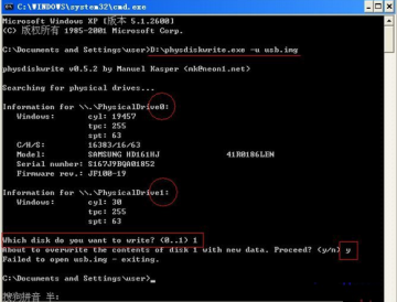 D:\physdiskwrite.exe -u usb.img ←这个“usb.img”按需要改成自己使用的IMG文件名!