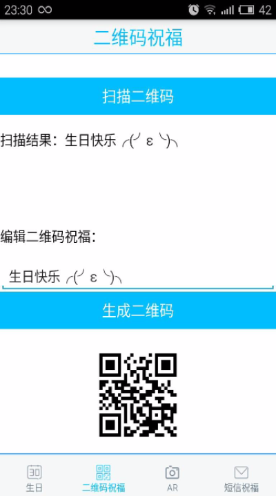 【二维条码祝福】你可以扫描亲友发送给你的二维条码,即可获取到二维码中存储的祝福文字信息;也可输入祝福文字信息,将其生成属于你的独一无二的二维码,发送给亲友,亲友扫描二维码即可获取到你送出的祝福。