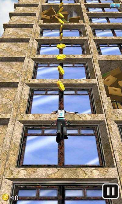 游戏在操作上非常简单,通过左右滑动来控制主角的方向,这一点同“陆地”的跑酷游戏相类似,通过向上滑动来翻越双层楼,对于聪慧十足的玩家们来说,入手那是没有丝毫难度,不过《疯狂攀岩家》只有触屏操作一种操作方式,没有传统的重力感应操作。不要以为只是向上攀爬那么简单,一路上困难重重。冷不丁上方的窗户一开,洗衣机、电视机、花瓶、吉他都朝玩家一股脑飞过来了,防备不及的话就只有掉下去的份了。在游戏中不慎被障碍物击中是可以通过花钱来继续游戏的,越高的楼层复活的代价就越大
