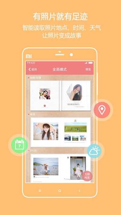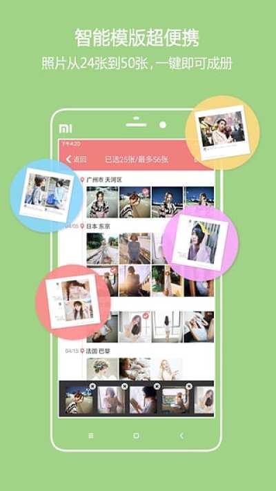 首创采用照片讲故事的模式,通过智能算法对照片的拍摄时间、地点、天气等进行分析,实现智能化的排版。用户只需从相簿选择照片,即可一键成册。