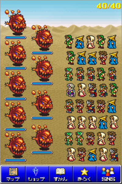 《最终幻想:勇气(FINAL FANTASY ALL THE BRAVEST)》是一款触摸屏RPG游戏。此游戏为最终幻想系列新作,并非移植自之前的某款作品,而是将之前的所有角色集合,采用全新剧情来演绎。这是一款粉丝向的游戏,没有炒冷饭,纯新作,专为触屏打造。游戏中全部角色来自最终幻想系列,如游戏名,是勇士的集结。连Boss也是,你闭上眼也能说出是哪一代的反派。地图风格就不言而喻了,音乐是植松伸夫的当年的经典配乐。