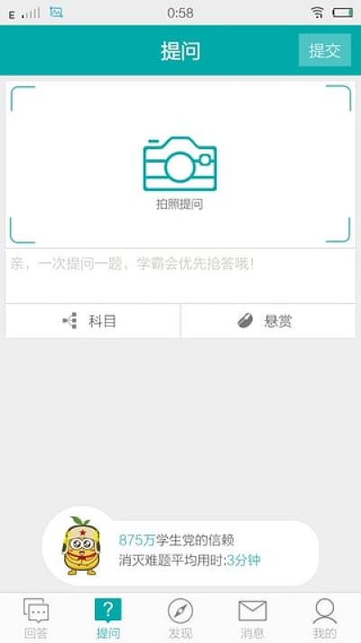 1.我要提问:选择学科,拍下作业题,或者文字输入,点击提交,即完成提问。