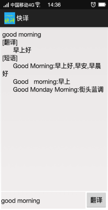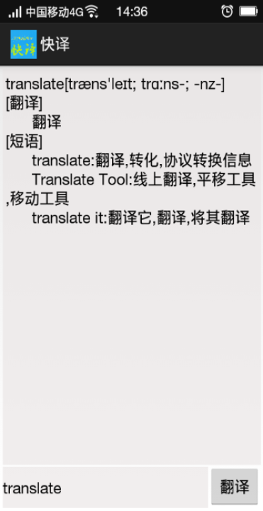 快译APP的功能非常简单实用,就是快速的翻译英文句子。同时还能够对句子里面的短语进行详细的解释,对于英语初学者来说非常的有帮助。