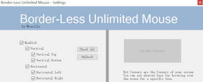 Border-Less Unlimited Mouse 的设置很简单,你就是勾选是否启用「Enabled」鼠标穿越的功能,然后是启动垂直方向「Vertical」还是水平方向「Horizontal」,甚至你还可以进行单边设置。设置完毕以后,你再试试将鼠标移动到屏幕的边缘,从右边过去,看鼠标是不是从左边出来了?
