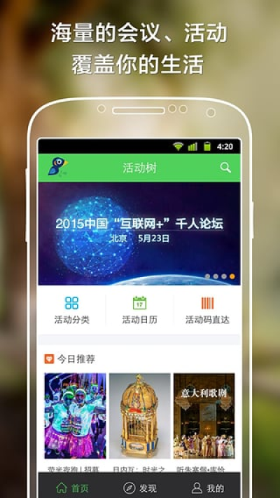 周末去哪儿?爱上活动树!创业故事分享,互联网会议、全球营销烧脑夜……让你的职业逼格提升起来!休闲、生活、娱乐嗨起来,各种社交圈子玩起来,还有免费电子票赠,让你随时随地拥有最精彩的活动体验!