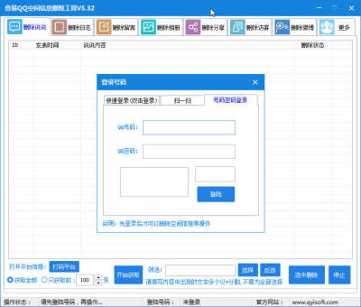 奇易QQ空间信息删除工具是一款QQ空间辅助删除工具;能够帮助用户批量删除空间说说、日志、留言、相册、分享、访客、收藏、与我有关、微博、群管理等QQ空间相关功能,不用担心删不掉,也不用一条一条删除太麻烦,奇易可以帮你;软件需登录QQ号才能使用,支持持QQ快速登陆、扫描二维码登陆和账号密码登陆。有需要的朋友可以下载体验一下。