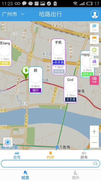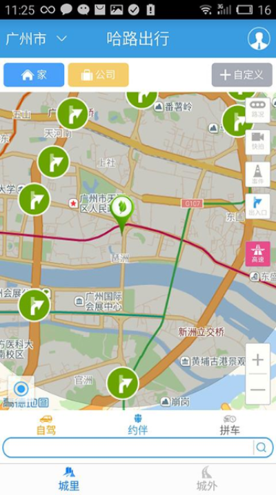 哈路出行”分“城里”“城外”和“我” 三个模块,“城里”实现常用路线的定制和导航、市区路况,周边高速出入口及约伴信息;