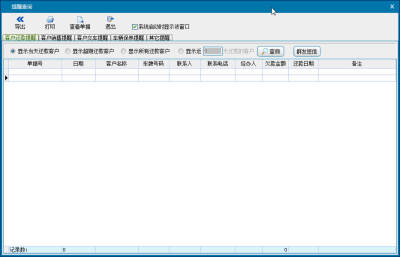 提醒功能,每次软件启动时可以弹出提醒窗口,提醒的内容分为客户还款提示、交车提醒、其它提醒。
