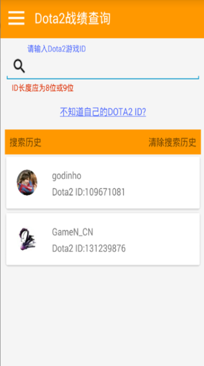 1.战绩搜索:输入你的Dota2 ID,停止输入后软件会自动获得你的个人档案并在“搜索历史”第一栏显示,点击档案查看个人档案及最近比赛。长按记录删除该档案。