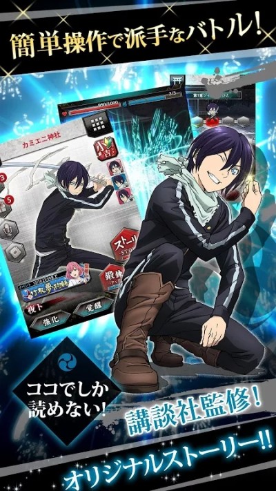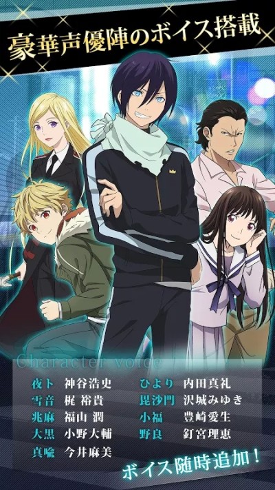 在在讲谈社《月刊少年》上连载的漫画《野良神》,以此为题材开始首次发行手游,并且在游戏中可以看到现在放送中《野良神ARAGOTO》的登场角色。一起享受原创故事的卡牌战斗RPG游戏。当然游戏中也是有语音附着的。 另外,现在开始上架,在游戏中准备了特别登录活动,登录就送SR毘沙門卡牌和其他道具。