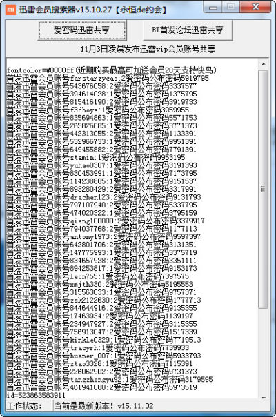 永恒迅雷会员搜索神器是一款简单易用功能强大的迅雷会员搜索神器,能够帮助用户获取大量的迅雷会员账号信息。软件工作时将会搜索两个论坛的迅雷帐号密码,然后再显示在软件中,喜欢的话快点来下载使用。