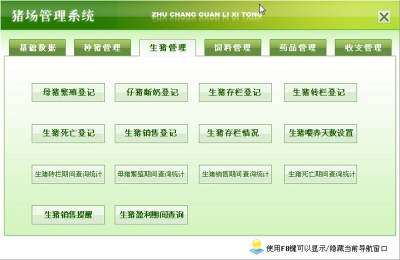 3.生猪管理主要包括母猪繁殖登记、仔猪断奶登记、生猪存栏登记、生猪转栏登记、生猪死亡登记、生猪销售登记、生猪存栏登记、母猪繁殖期间查询统计、生猪销售期间查询统计、生猪死亡期间查询统计、生猪转栏期间查询统计和生猪盈利期间查询;