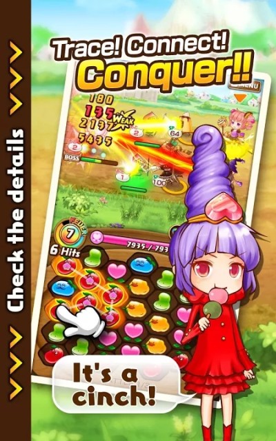 舒爽的操作感! 操作简单!只要消除将3个以上连在一起的彩砖就行! 连得越多攻击力也会上升,还会出现可以消除所有同属性彩砖的特殊彩砖! 只要轻触特殊彩砖就能消除所有同色彩砖,是非常强力&爽快的彩砖!