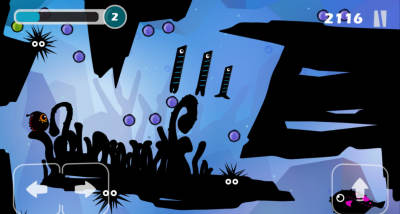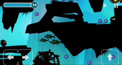 精灵,生命值上限为10,每过5s会自动减1,每获得1个气泡(光团)生命值会加1;玩家通过点击屏幕下方三个按钮(左、右和向上跳)来操作精灵避开海底生物(鱼类、海胆),并尽可能地获得气泡来延长游戏时间。如碰到海胆、电鳗、石头鱼、鮟鱇鱼、鲨鱼则会立即死掉,接触其他鱼类则会失去1点生命值。游戏结束时会给出分数(按照向右最大坐标来赋值)。