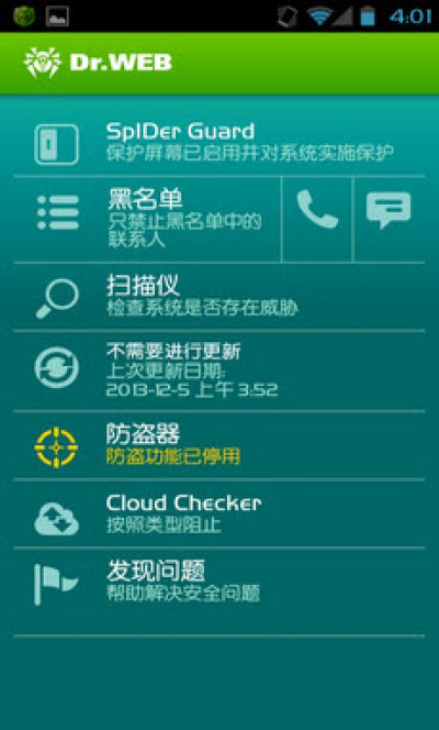 Dr.Web反病毒软件是一个功能非常强大的手机杀毒软件,其性能要远强于其它同类软件,其以独一无二的非特征风险程序运算法则而著称,深受用户的好评,喜欢的朋友可以在这里免费下载使用!