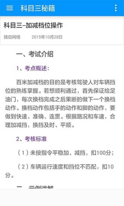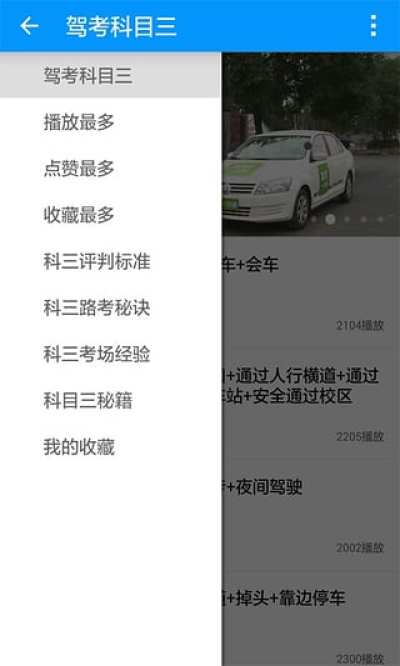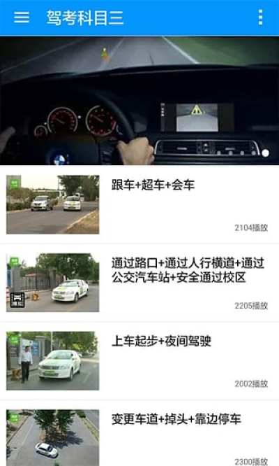 1、跟车、会车、超车。 2.科目三考场经验3.科目三秘籍指导。 尽在驾校科目三视频app.。