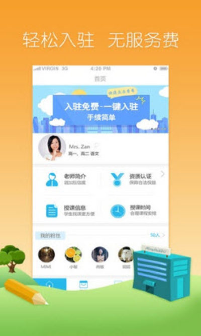 这款老师+手机应用是专门为老师们准备的,为用户提供了管理个人信息、上课时间和查看订单等服务功能,可以帮助你获得大量的生源,从而获取高额回报,提高工作效率,且完全免费哟,有需要的朋友快来下载体验吧!